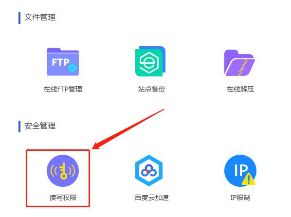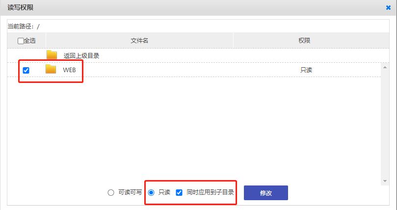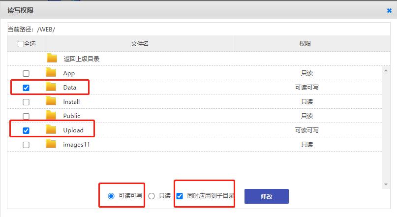 找到【讀寫權(quán)限】并打開,將網(wǎng)站根目錄設置為只讀,然后將Data和Upload目錄設置為可讀寫