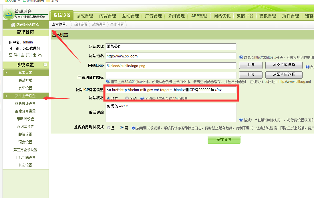 第一:打開后臺網址進入系統設置-基本設置 如下圖頁面,在箭頭地方添加如下代碼: