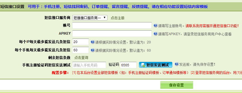 在后臺設(shè)置好短信接口,即可以擁有手機(jī)短信注冊、訂單短信通知、留言短信通知、手機(jī)短信找回密碼、反饋短信通知等