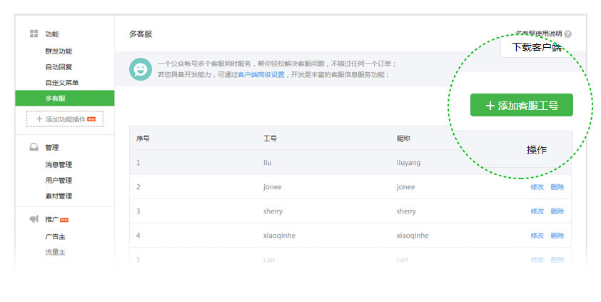 商戶在微信公眾平臺(http://mp.weixin.qq.com)開通人工客服權限以后,于“功能-多客服”中,添加客服。